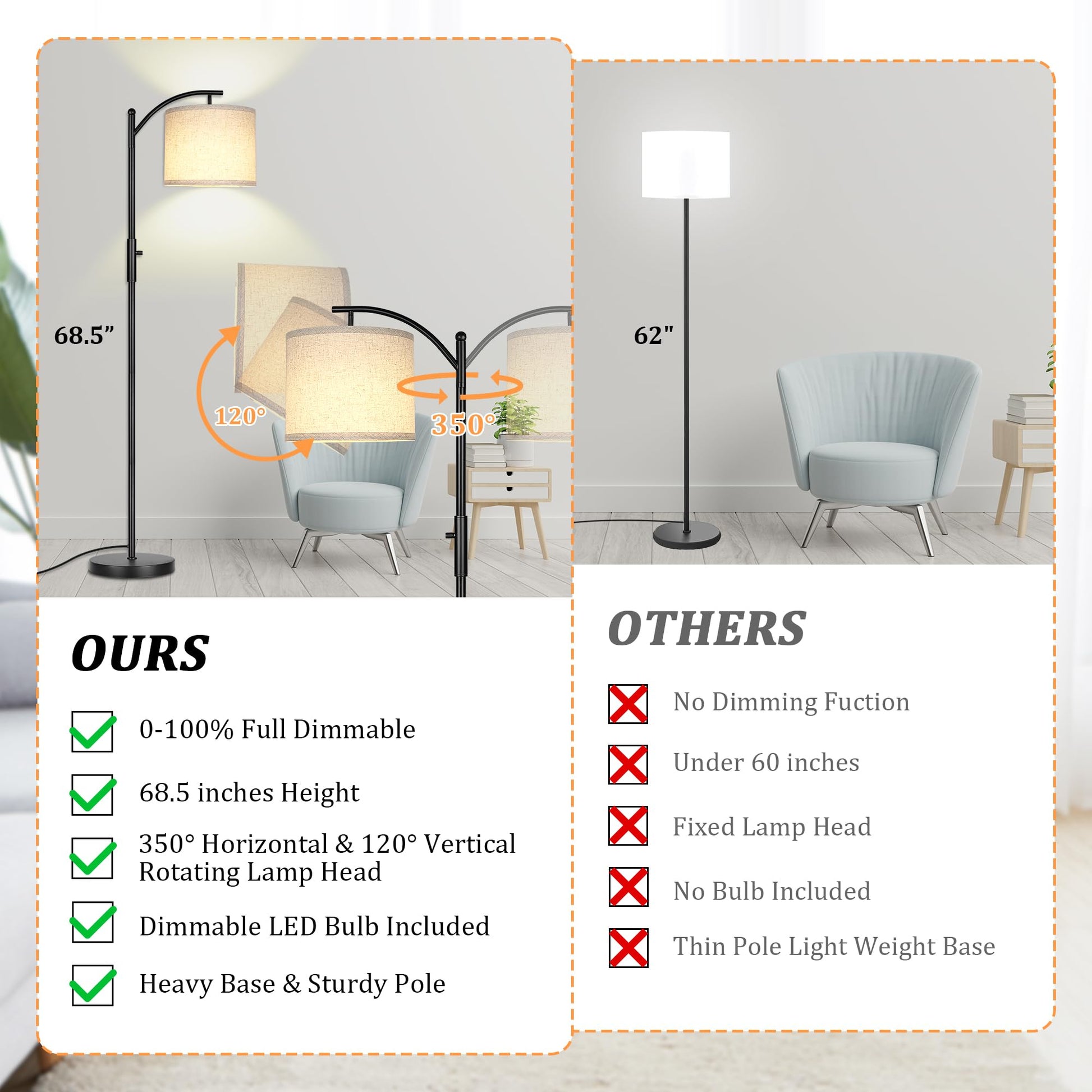 - Flexible Lampshade with 350° Horizontal Rotation & 120°Vertical Rotation: 68.5'' arc floor lamp comes with a rotating head that can be rotated horizontally or vertically, assuring convenience for daily life. When you put the floor light behind your couch, you can adjust the lamp shade to any angle you like, which is very proper for reading and working