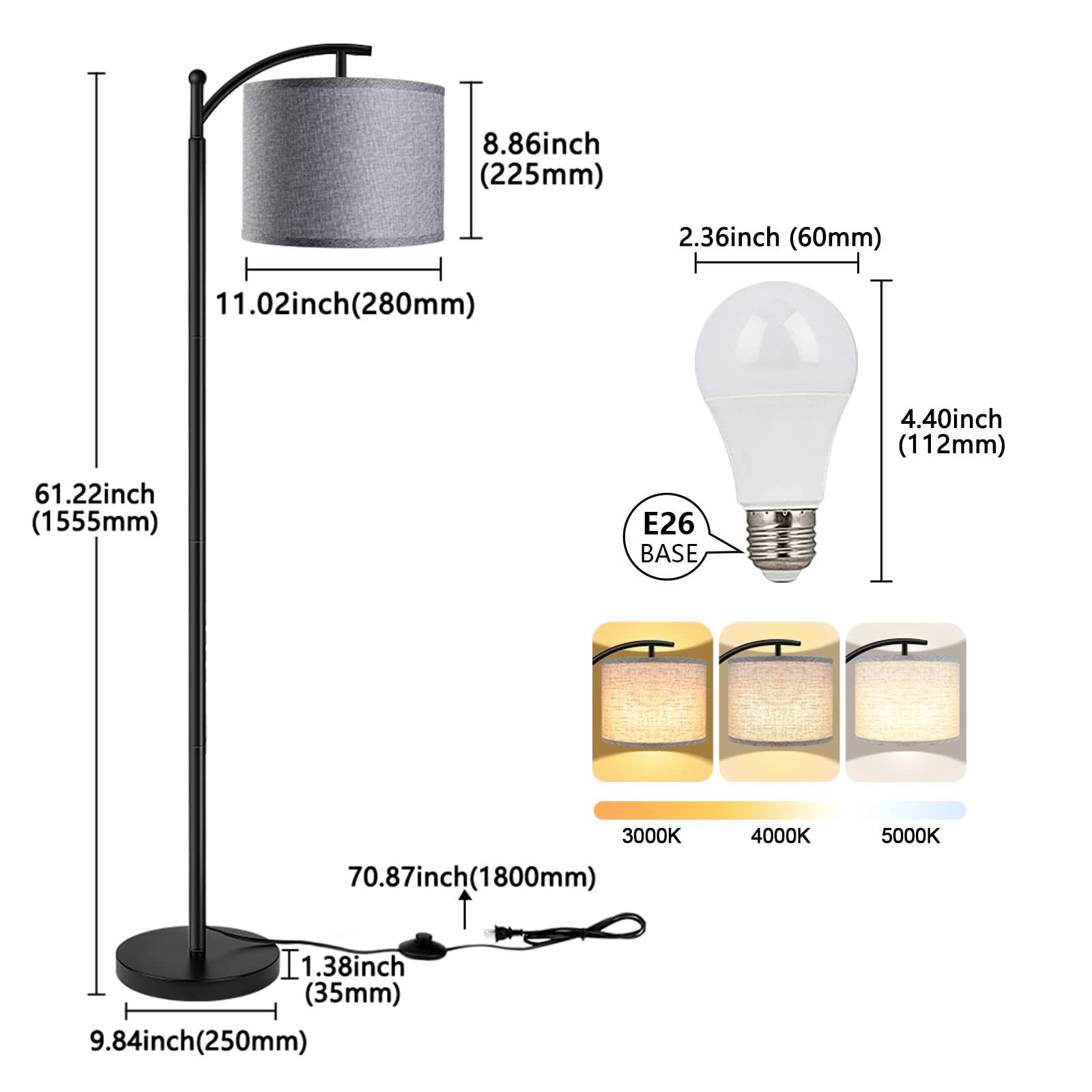 Floor Lamp with 3CCT LED Bulb, Lamp for Living Room with Gray Linen Lamp Shade, Modern Standing Lamp Floor Lamps for Bedrooms - Black