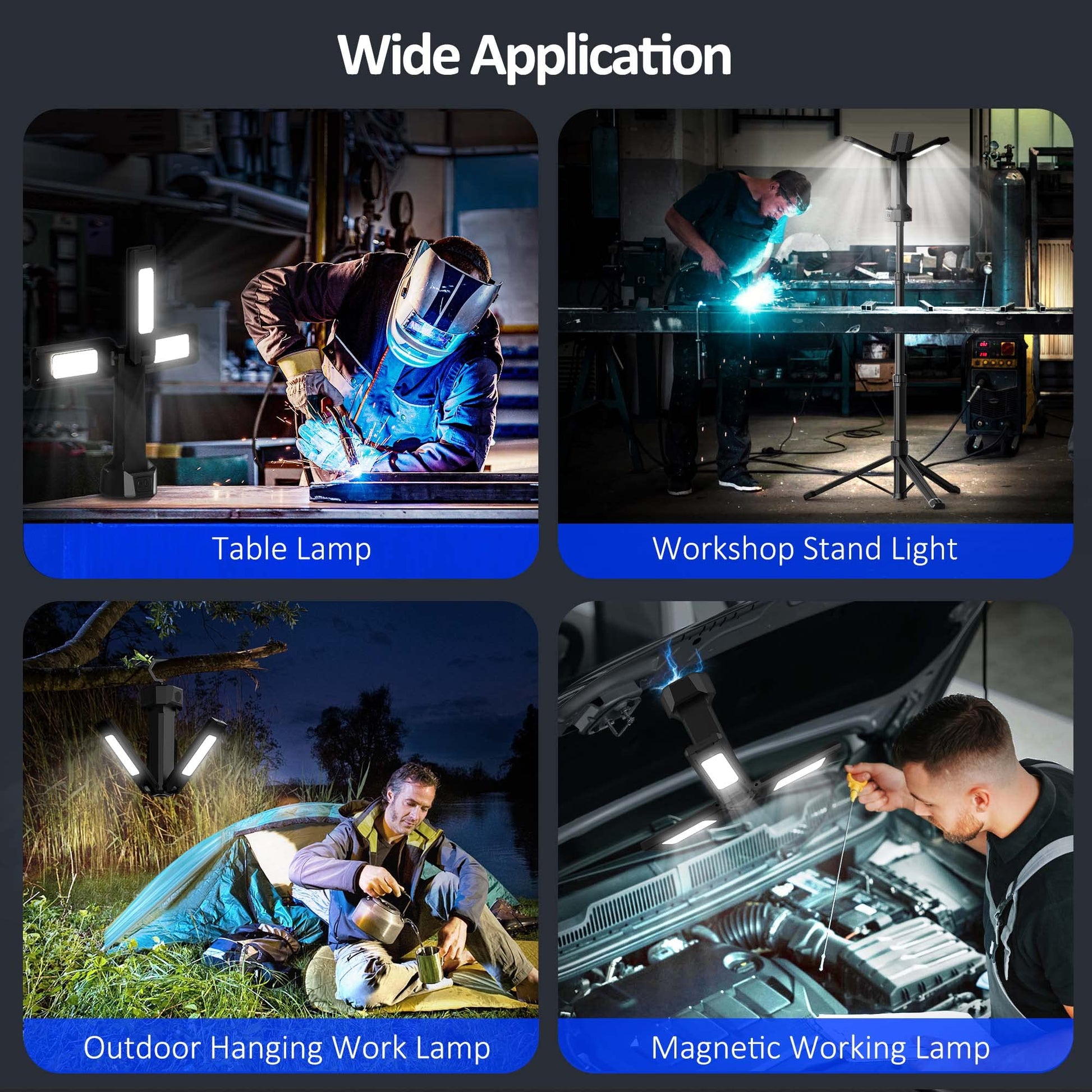 - Adjustable Triple Lamp Heads: our outdoor work light features a triple lamp head design. Each LED lamp can be freely adjusted vertically 180°and horizontally 270° rotation. Not only does this cordless work light provide better lighting coverage, but it also gives you more flexibility and convenience of use. Just pick the right lighting angle according to your task.