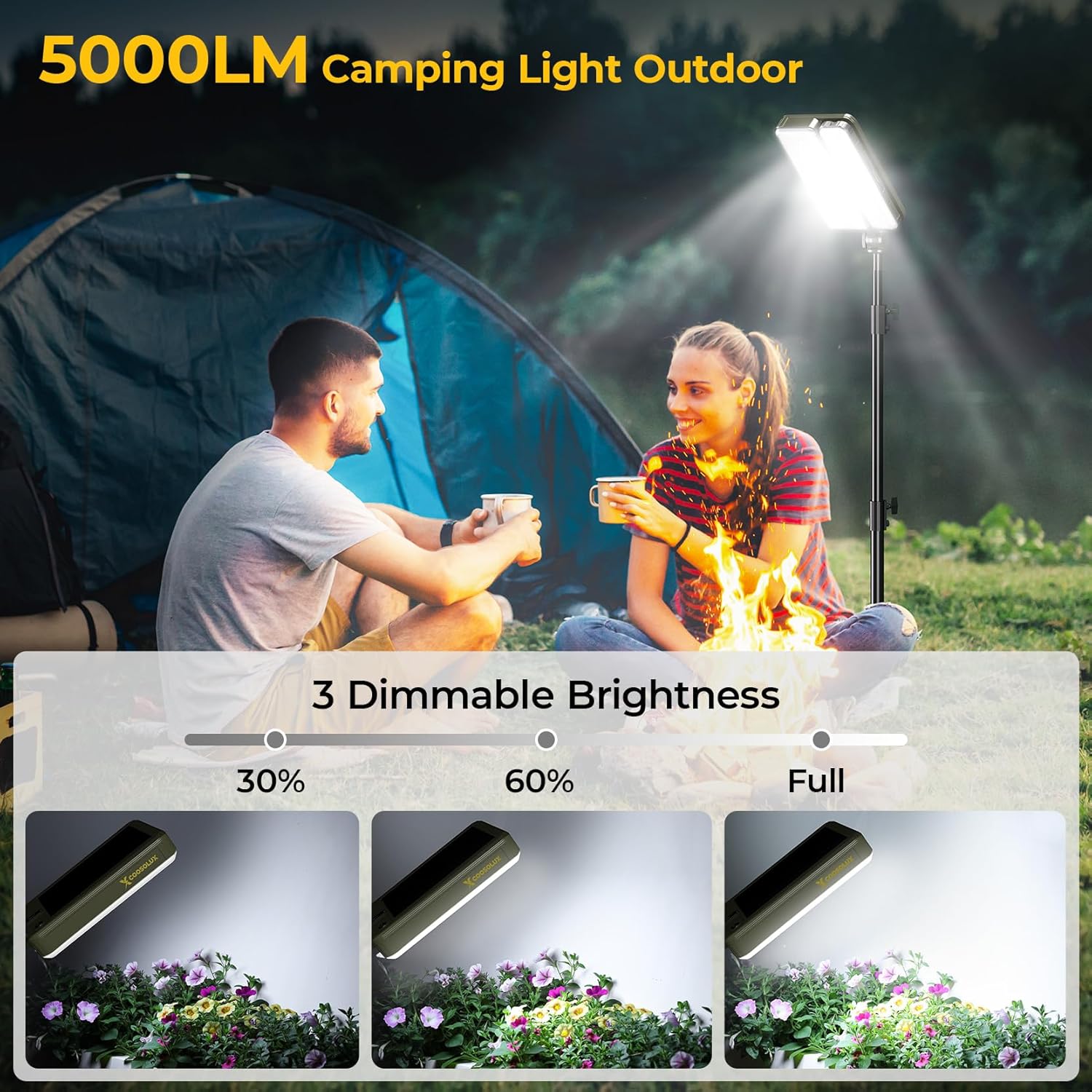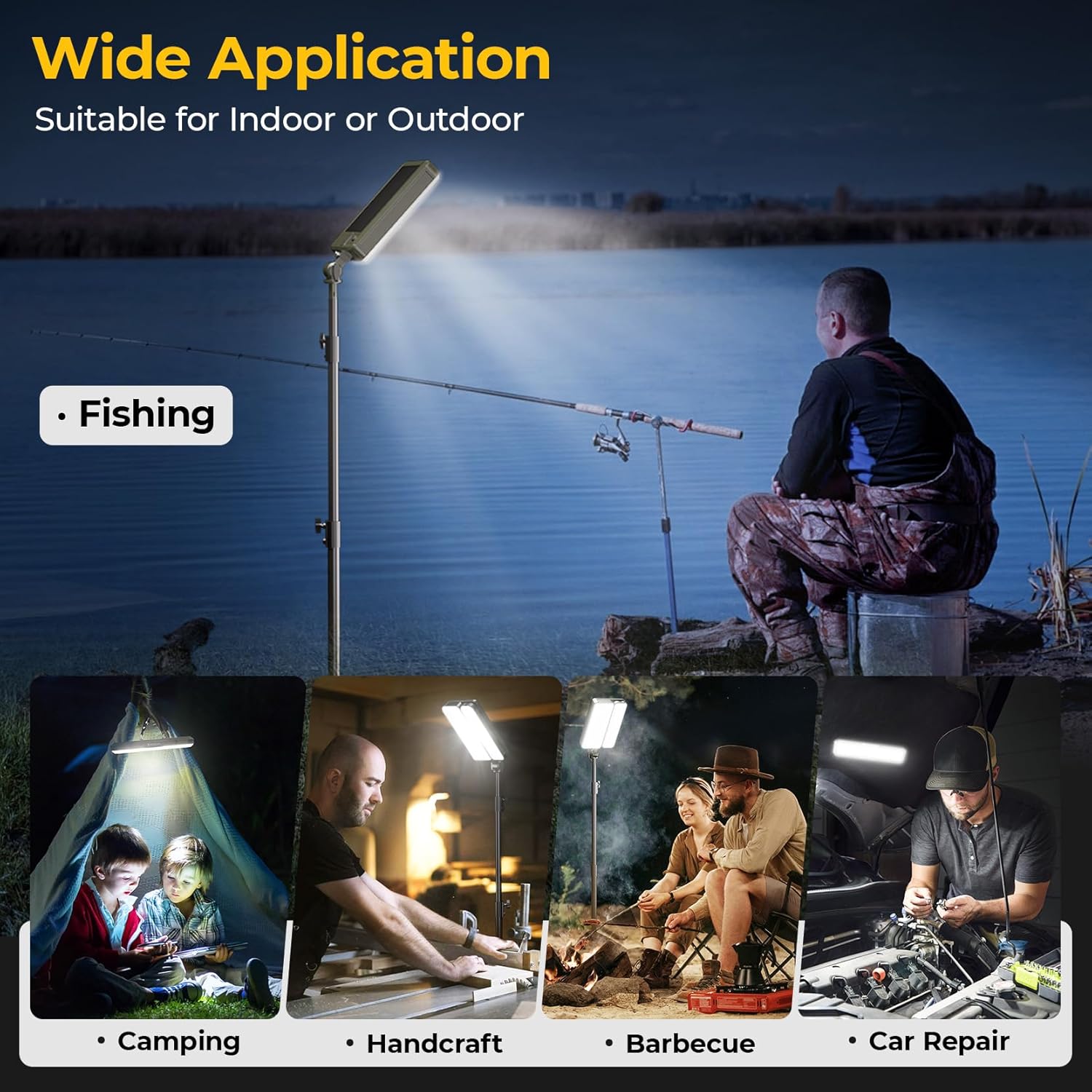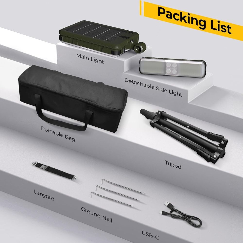 - Solar work light & camping light supports brilliant lightness for camping, hiking, fishing, car repairing, golfing and more outdoor & indoor occasions.
