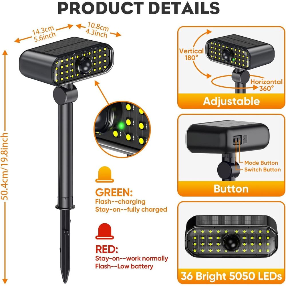High Efficiency Solar Power: Equipped with a premium monocrystalline silicon solar panel and 2200mAh battery, these spotlights achieve a 20% energy conversion rate for longer working time.