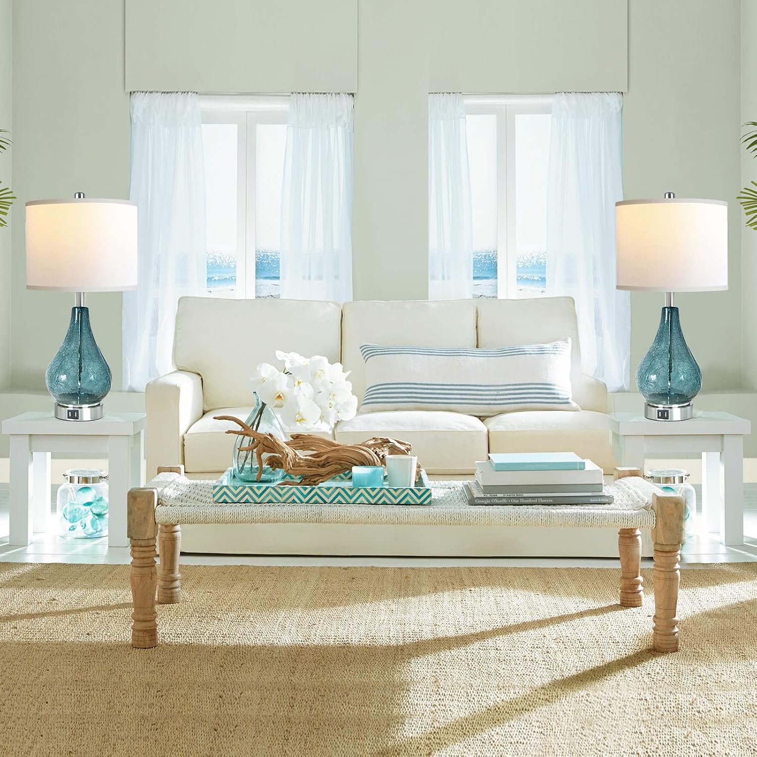 ROTTOGOON Glass Table Lamp for Living Room Bedroom Set of 2, 22.5" LED Light with Touch Control, Blue 3 Way Dimmable Modern Bedside Lamps for Home Decor with White Fabric Shade