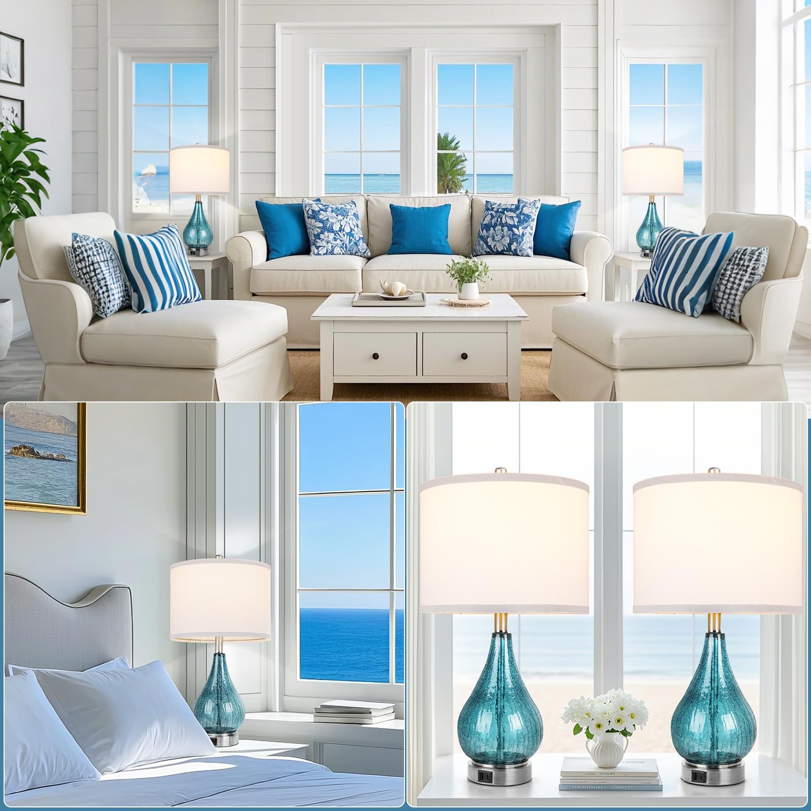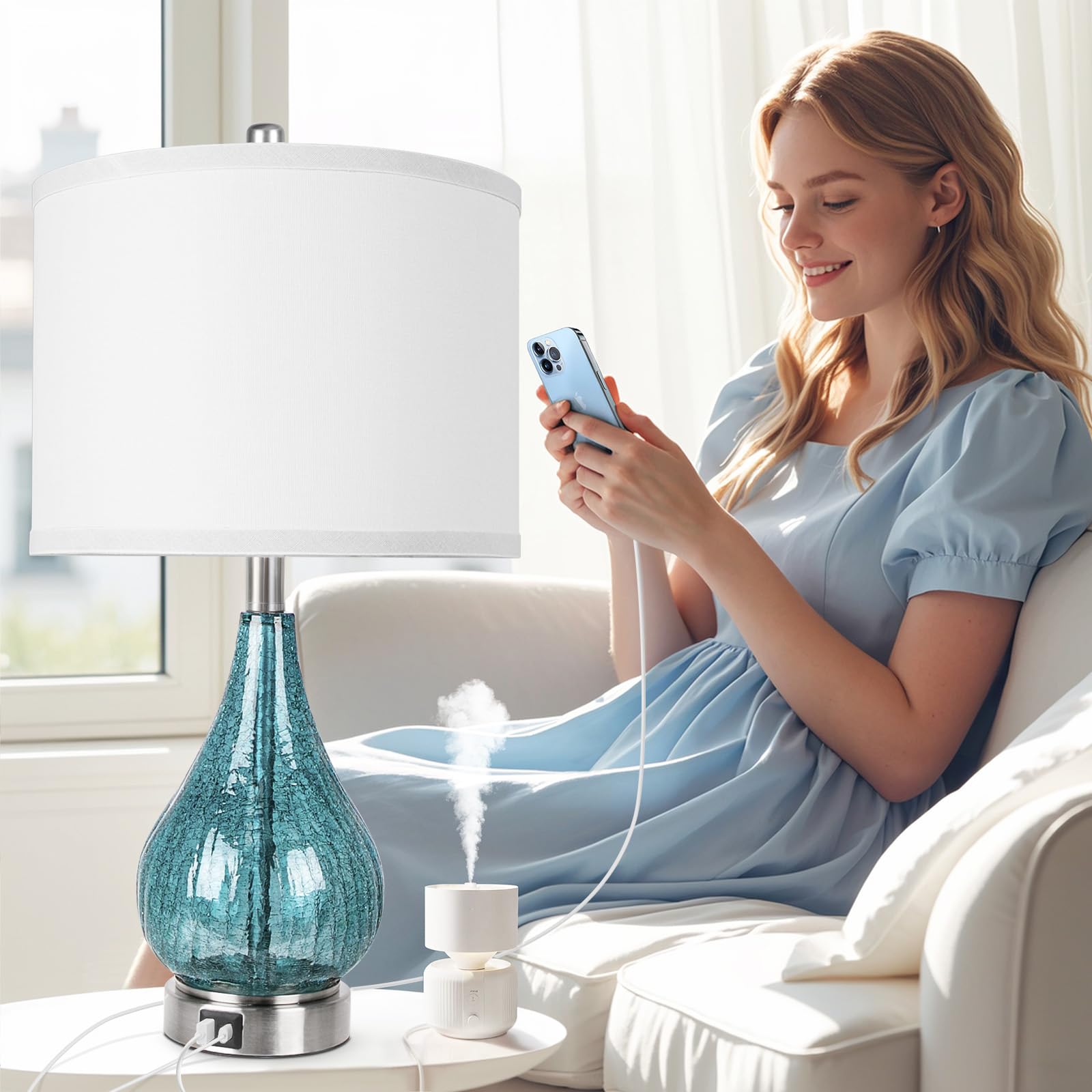 Unique Blue Ice Crackle Glass Design: Crafted from clear crackle glass and silver finish, this table lamp set of 2 is perfect for adding an eye-catching accent to any room in need of an upgrade. The shiny crackle glass lamp body below exudes charming charm, while a white fabric detachable assembled lampshade up above balances out the look, The blue glass table lamps are just the perfect accent lamps to give some color to living room and bedroom.