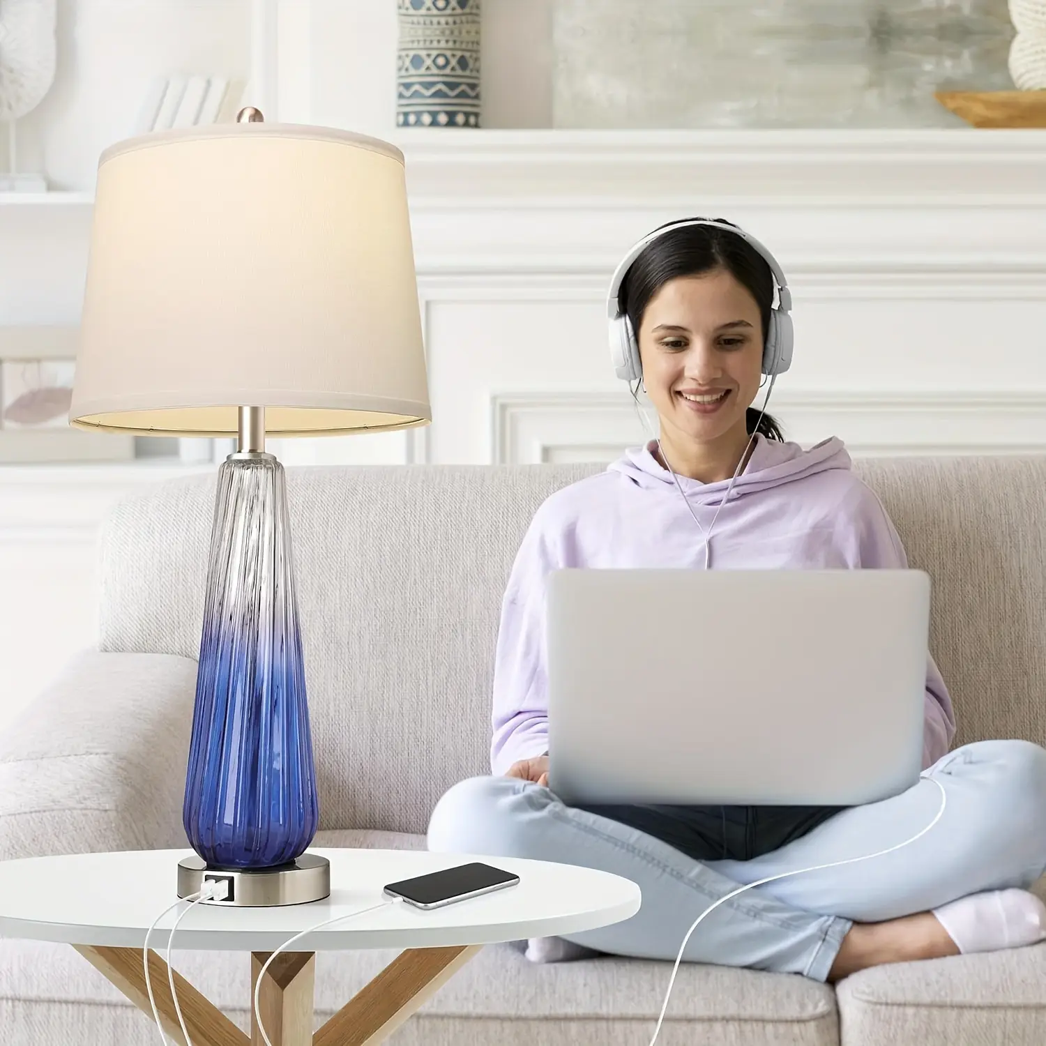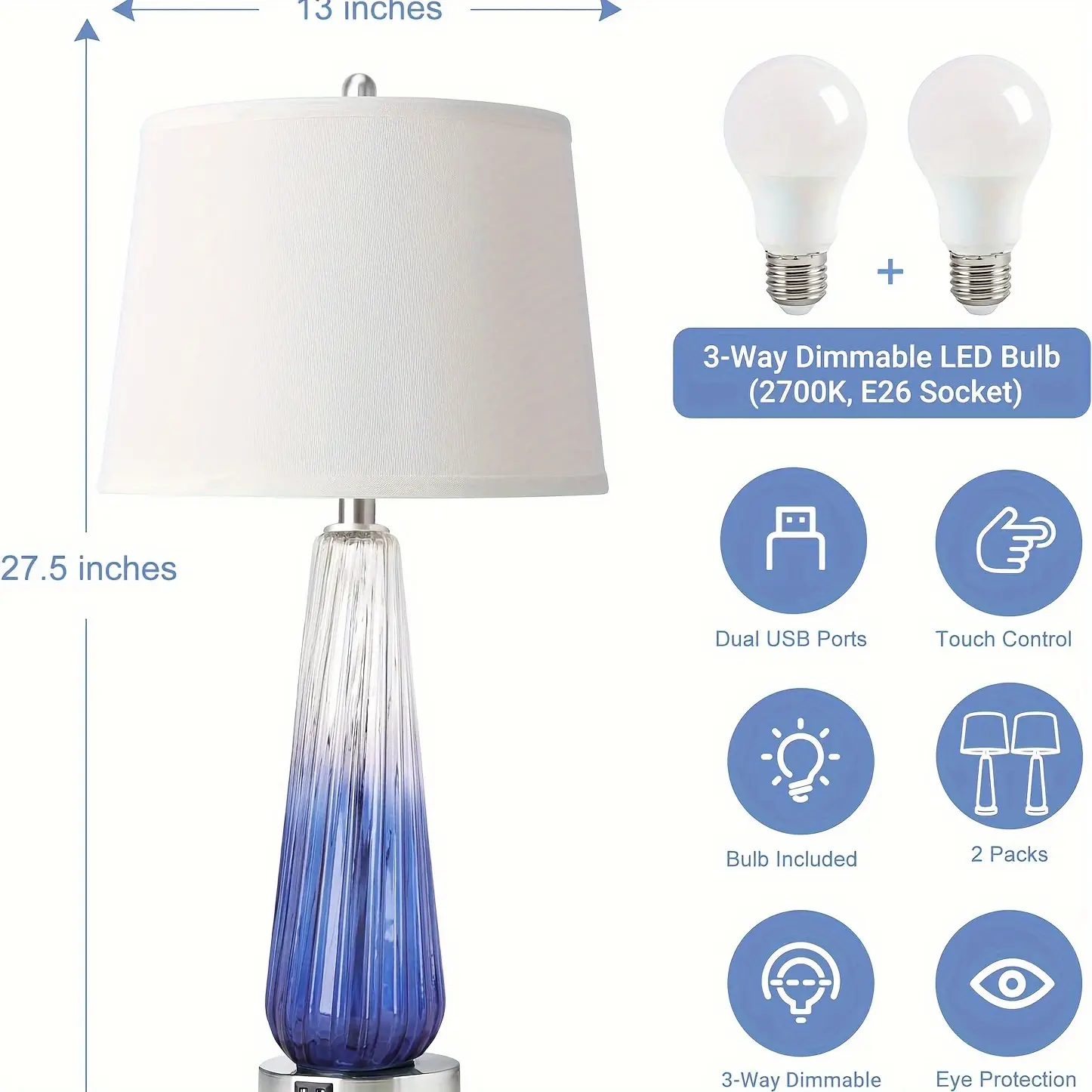 ROTTOGOON 27.5" Glass Table Lamps for Living Room with USB A+C Ports, Dimmable Touch Control Nightstand Lamp, Bedrooms Decor, Blue, 2 Pack