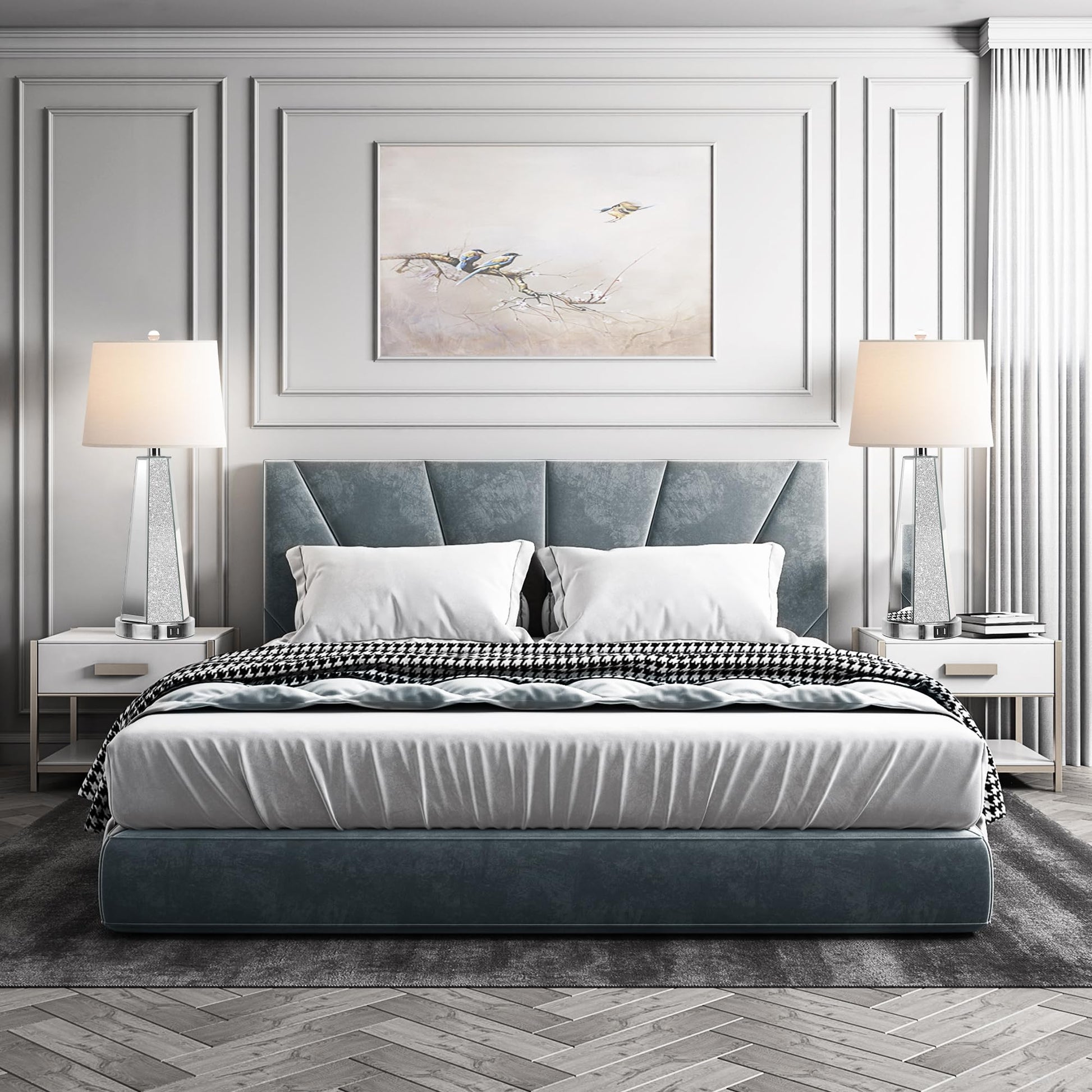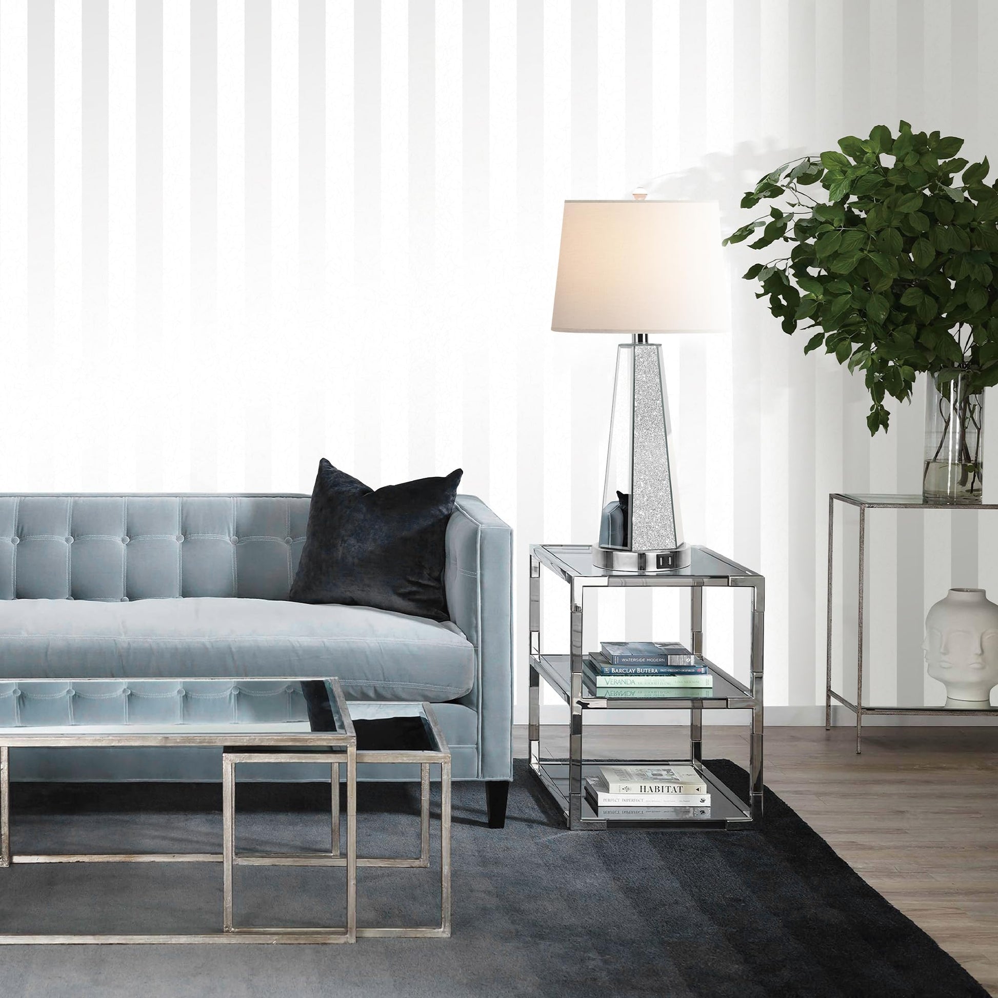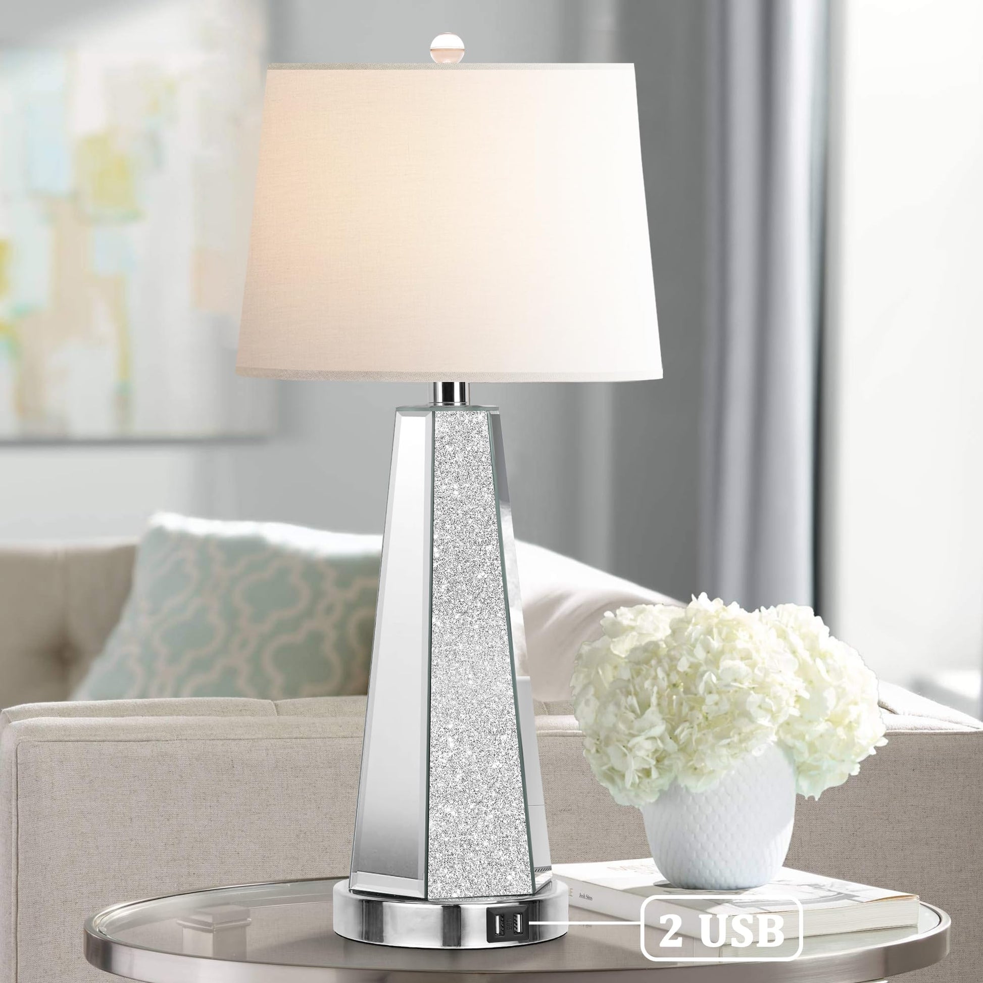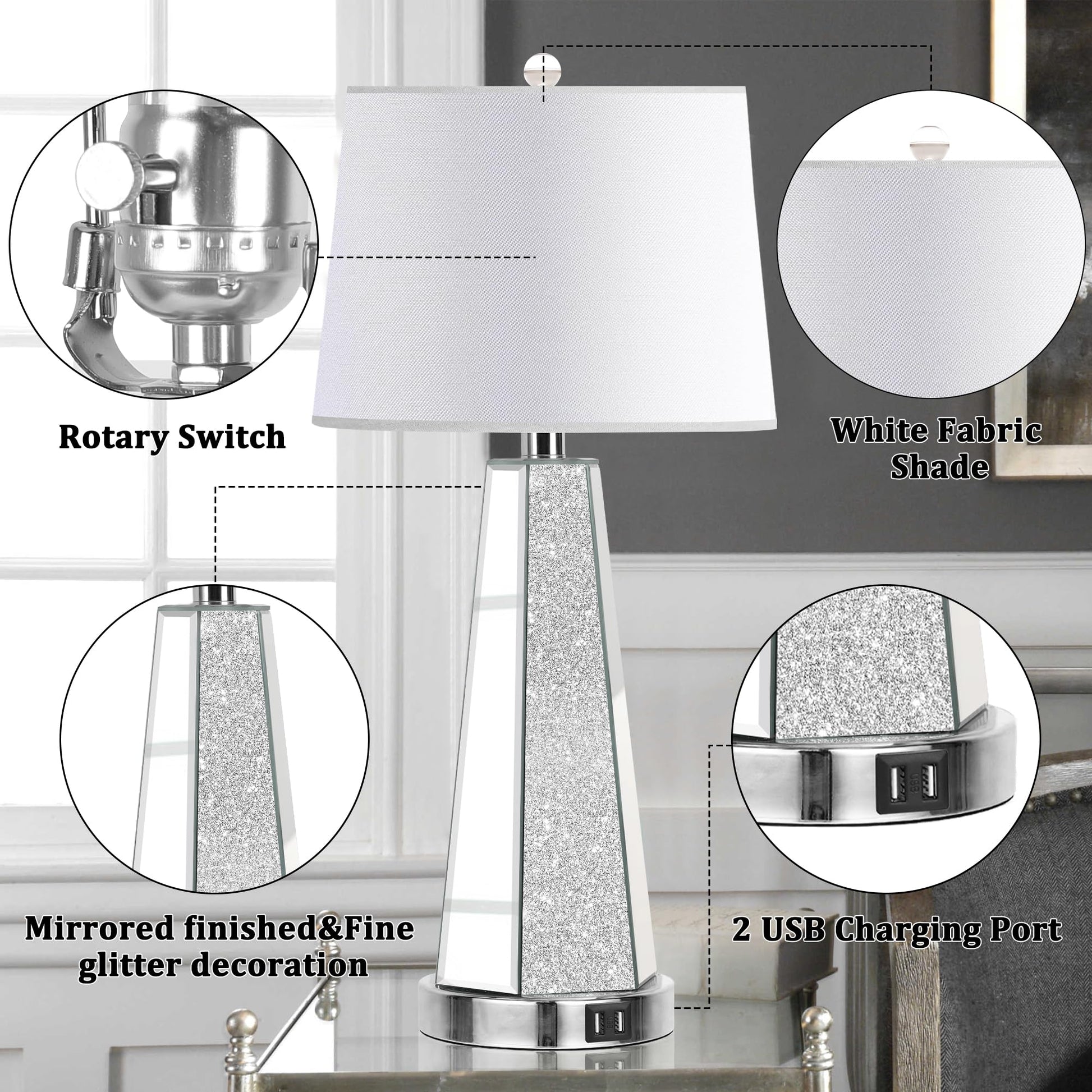 Built-in 2 USB ports:The two glamorous lamp features two conveniently located USB ports right on its base.These ports are compatible with most electronic devices.No more searching for an extra outlet or USB adapter-simply plug in your device directly into the lamp and enjoy easy access to charging.