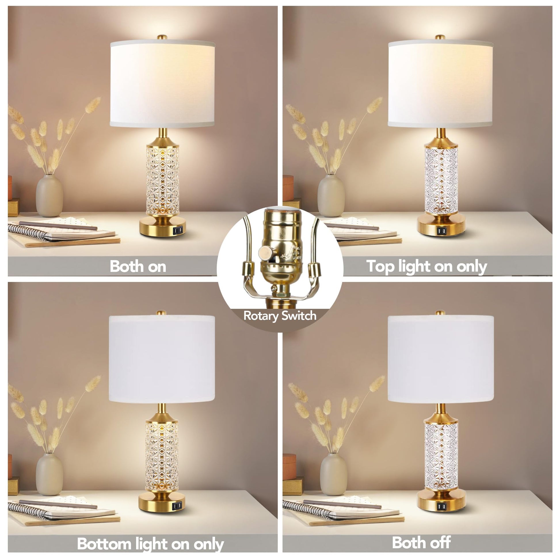 【Top Table Lamp and Bottom Night Lamp】This gold table lamp set of 2 offers a variety of lighting options. You will get regular table lamps and night lights, controlled on/off by a 4-way rotary switch: table lamp on, night light on, both on, both off, glass table lamp with USB providing you with enough lighting options to meet your different needs walking in the dark, accompany you before bed, gold table lamp modern also allows you to find your way easily and safely when you wake up at night.