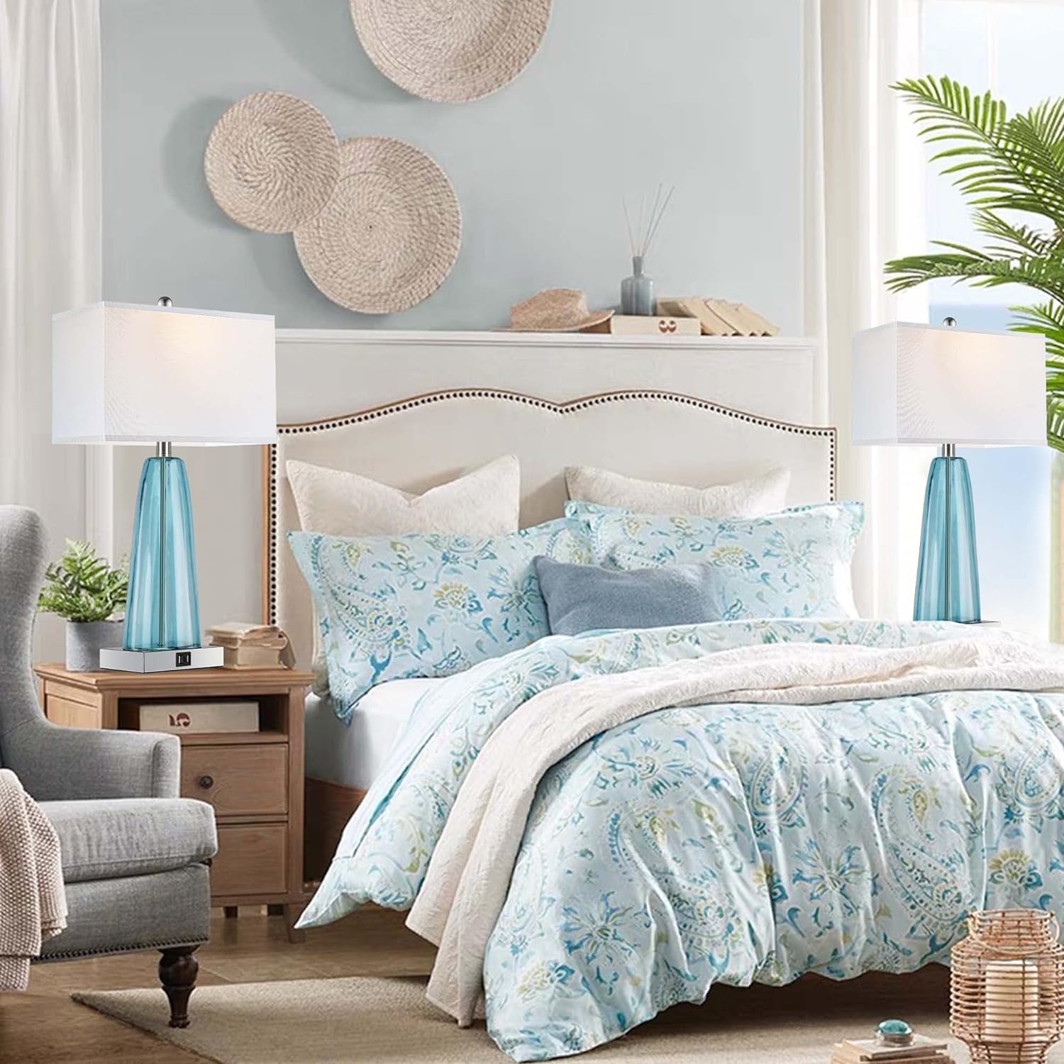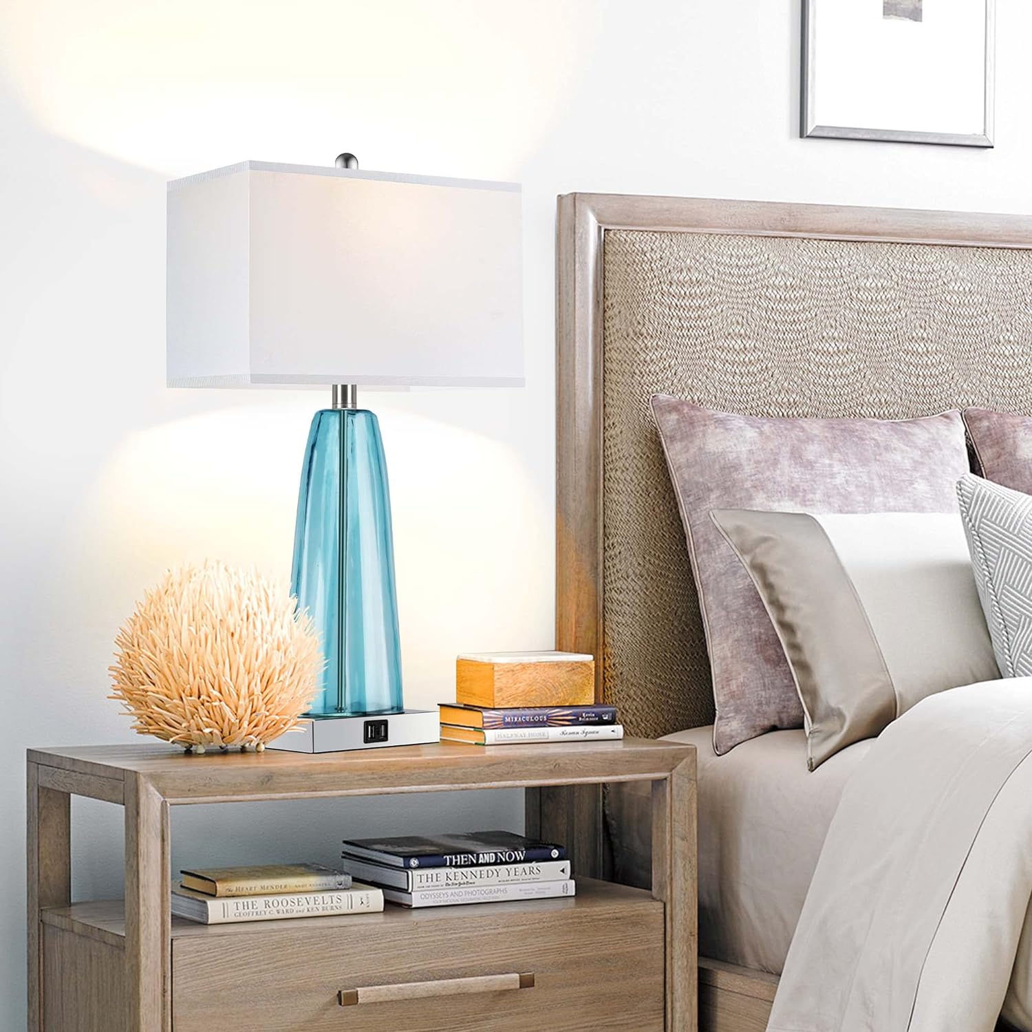 - Modern coastal glass table lamp: paired with a rectangular white fabric shade, its' teal-toned glass with draping detail alongside brushed nickel accent combines simplicity and the right touch of color. The ripple design of the glass adds a strong and sophisticated look, adding instant eye-catching appeal to your space. If you're seeking simplicity with a dash of uniqueness, this is the perfect table lamp set for you!