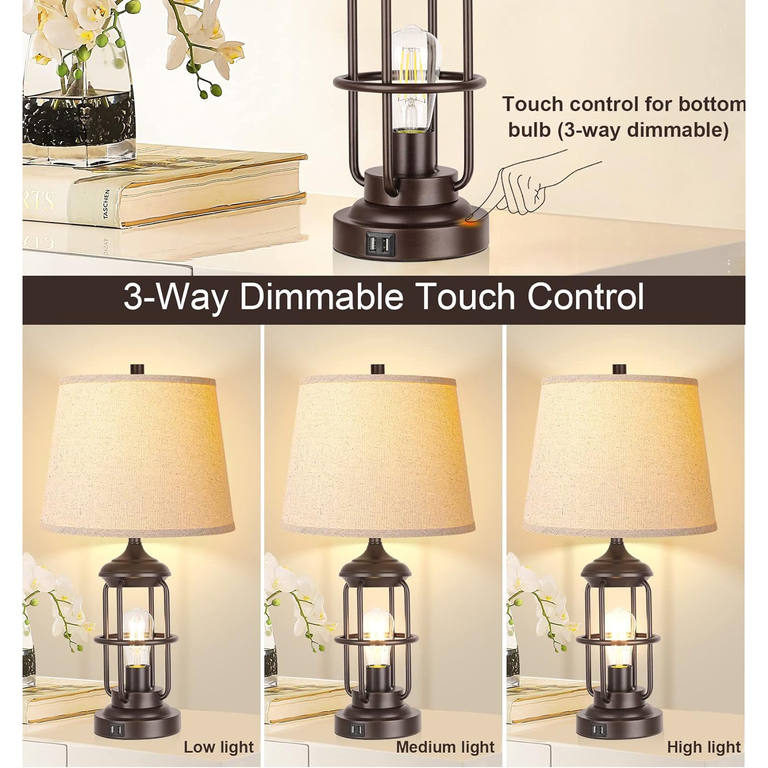 - 【Noiseless touch control & & rotary switch】: Just turn the touch lamp on and off or adjust the bottom night light (low/medium/high)with a simple tap on any metal part of the lamp holder. Switch the rotary switch clockwise to control the top bulb. 2 lights can also be turned on separately at the same time brightening your family when you gather together. Or just turn the top bulb on to accompany your baby to fall asleep and or just the bottom bulb on to light space for your reading.