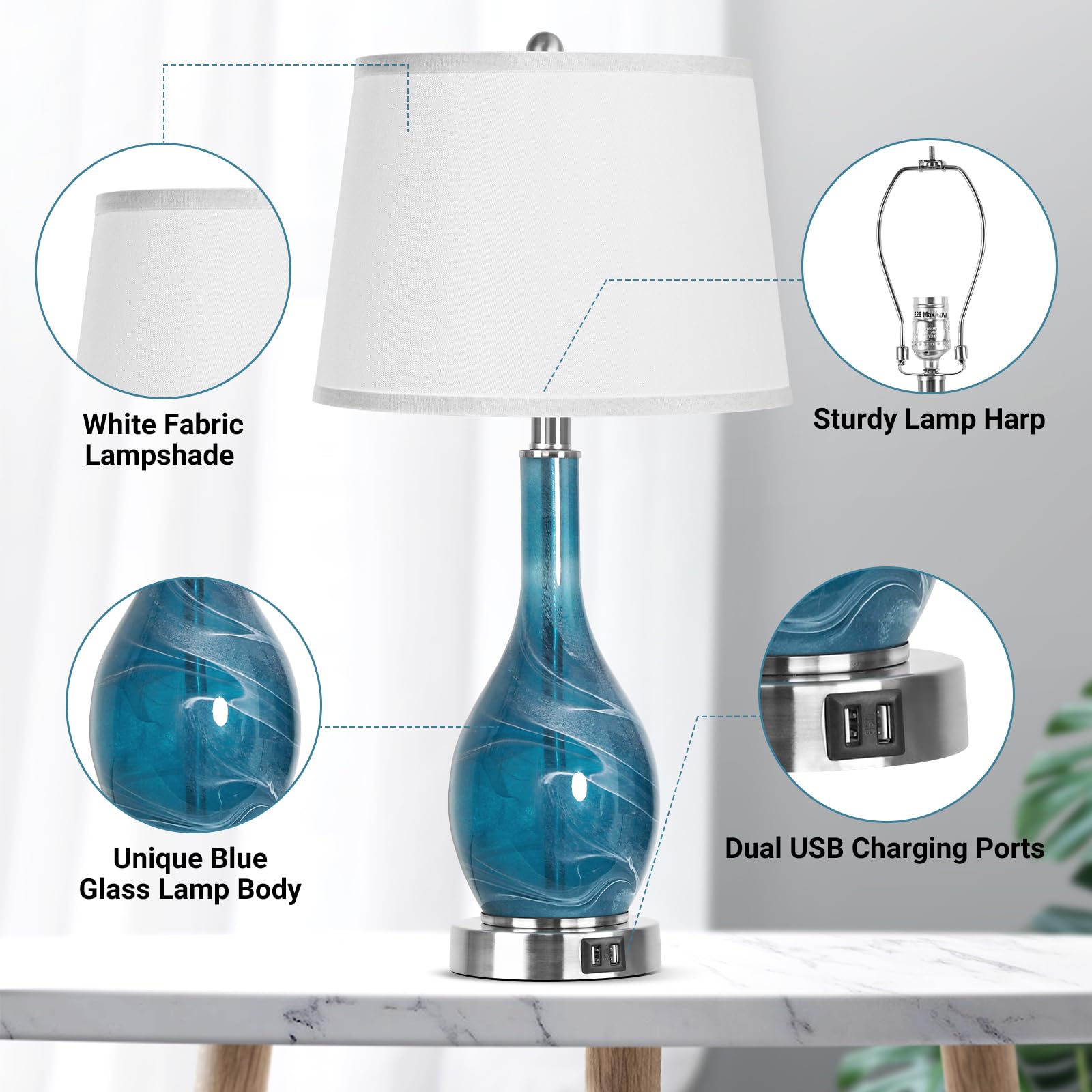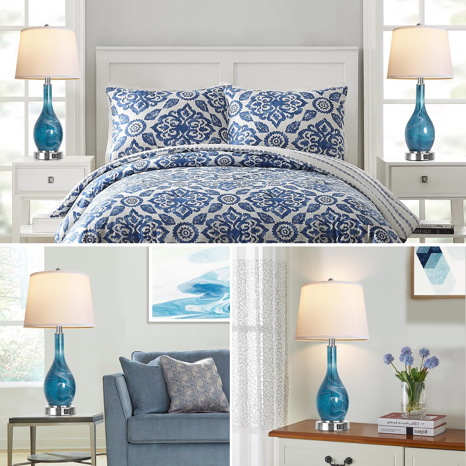 Eye-Catching Blue Glass with White Veins Design - Crafted from clear glass and silver finish, the lamps for living room end tables add a pop of color to any room. The modern table lamps with transparent blue glass vases and shiny metallic-finished base, add a touch of glamour to your space. Each glass table lamp exhibits a different white texture that grabs glances in any arrangement. The sleek silver base and premium white fabric shade complement any decor style from minimalist to retro.