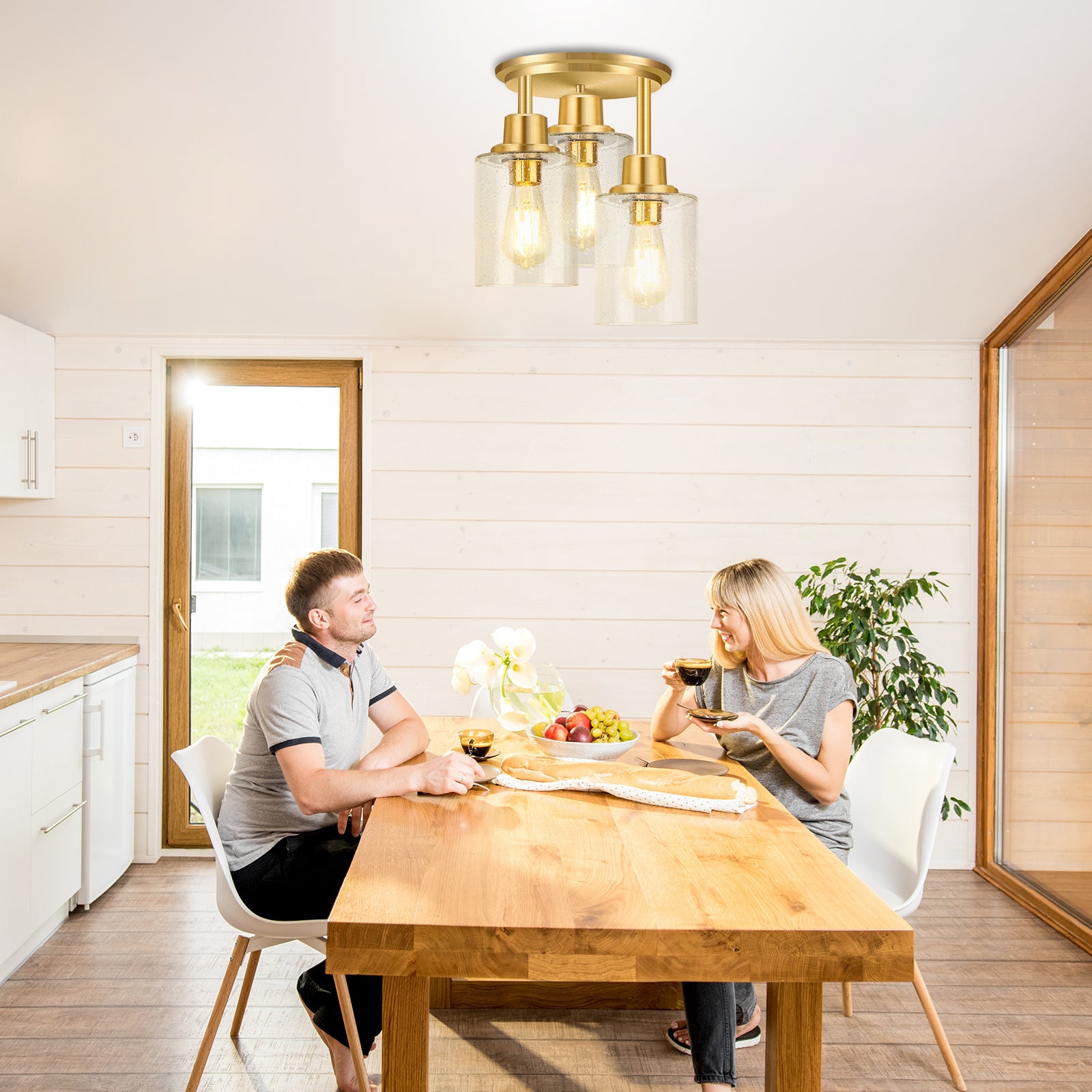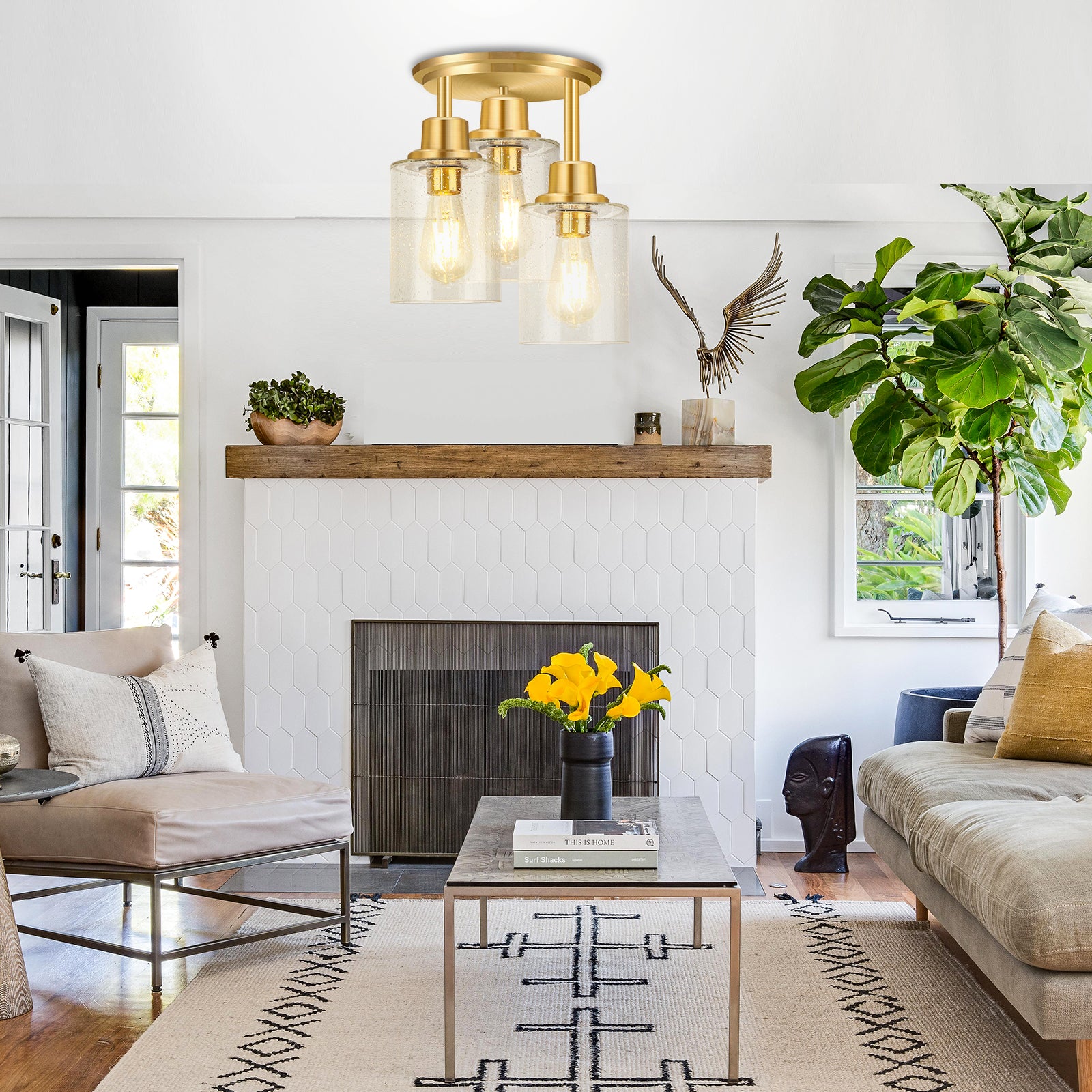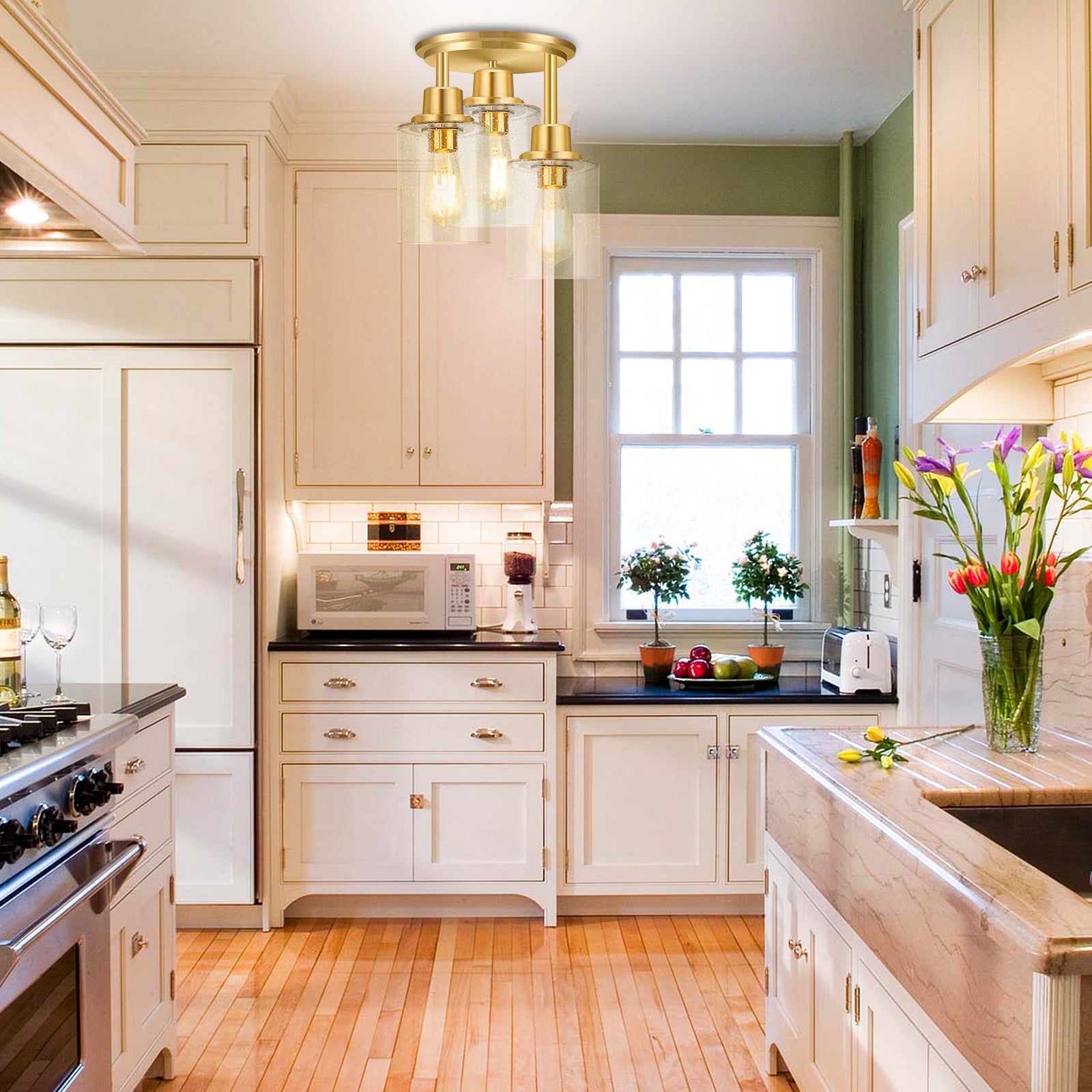 - Modern Stylish Design Lighting: A design mixed with industrial and contemporary elements, brass gold finished and clear seeded glass shades, this semi flush mount ceiling light complements most home decoration styles, which is perfect for kitchen, entrance, hallway, dining room, living room, laundry room, balcony and more.