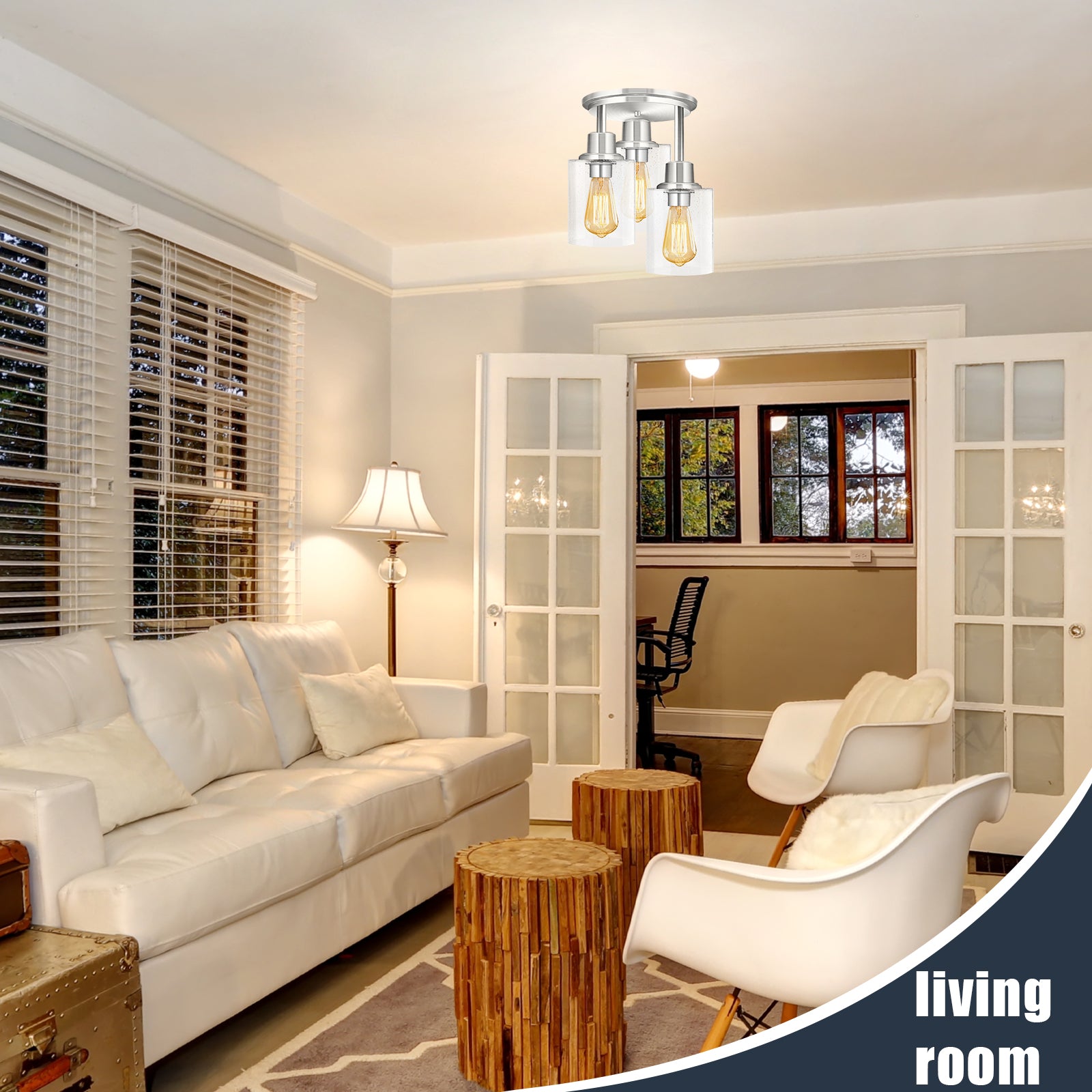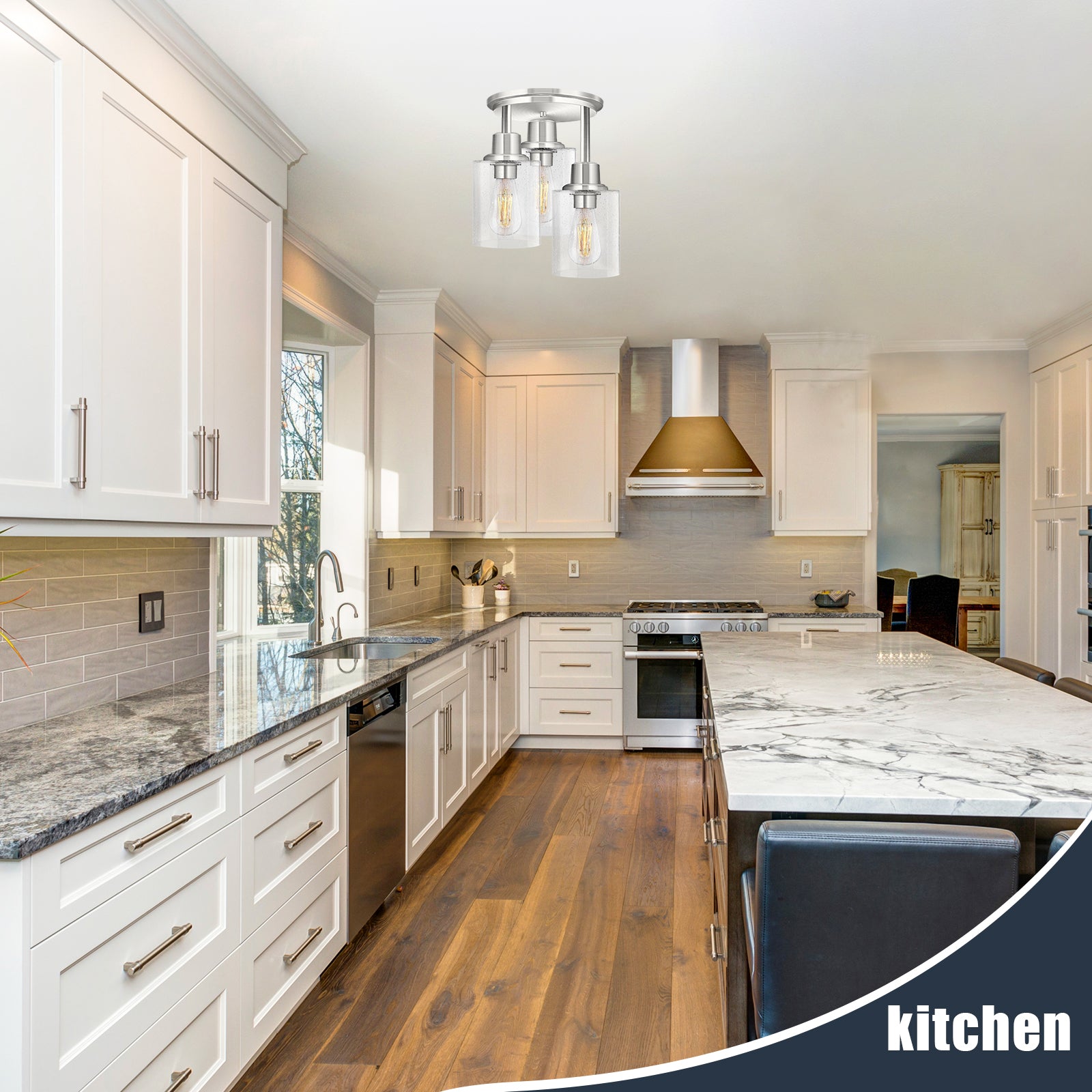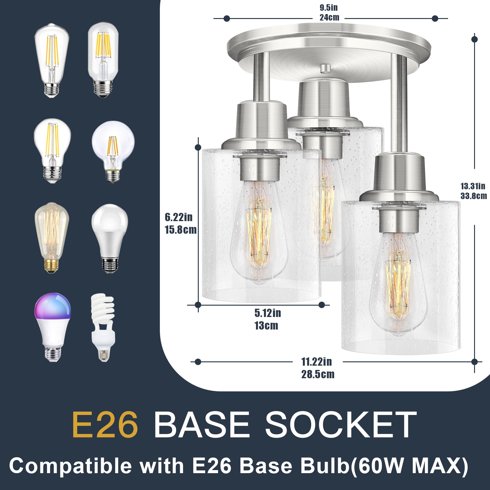- 【Modern Stylish Design Lighting】A design mixed with industrial and contemporary elements, brushed nickel finished and clear seeded glass shades, this semi flush mount ceiling light complements most home decoration styles, which is perfect for kitchen, entrance, hallway, dining room, living room, laundry room, balcony and more.