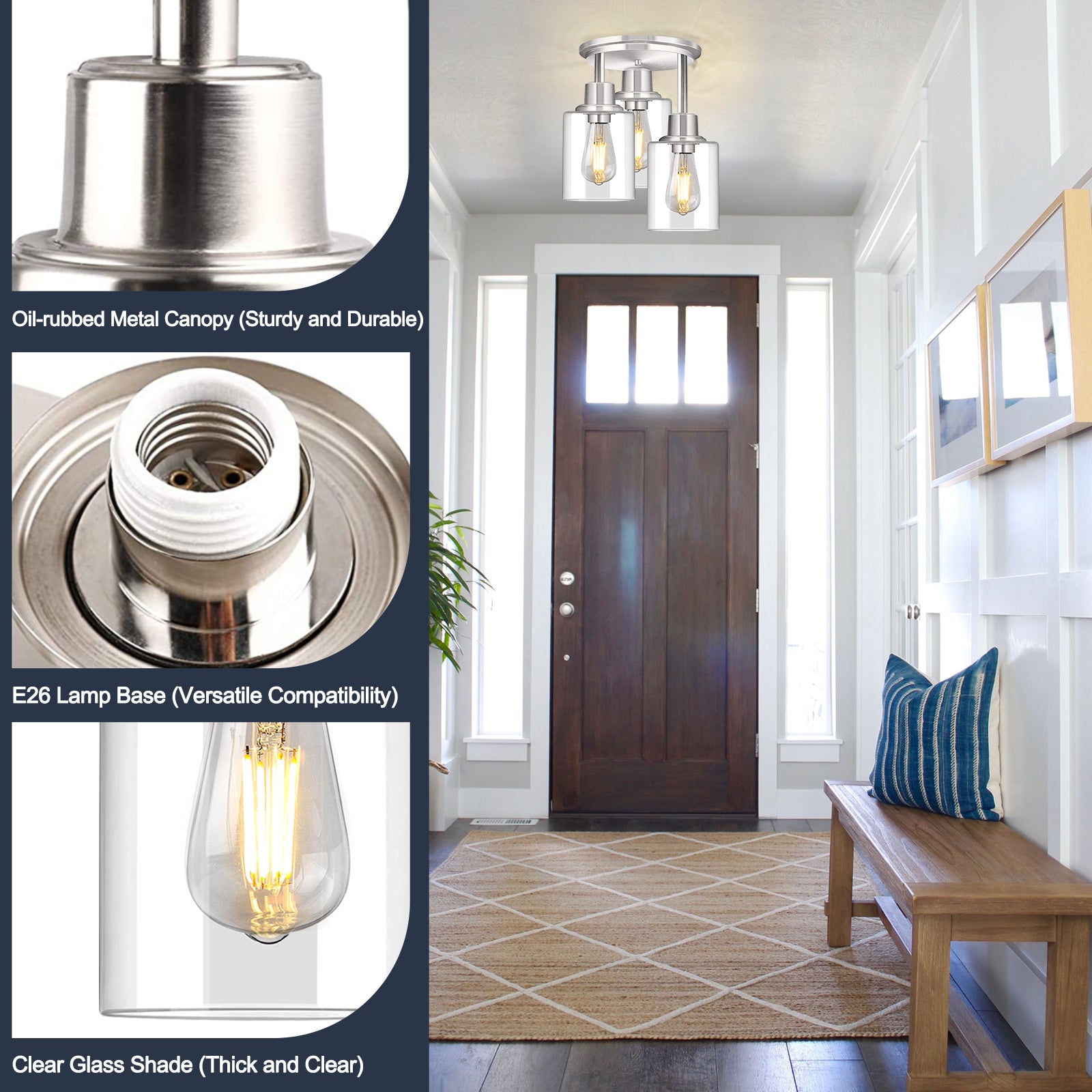 Semi Flush Mount Ceiling Light, 3 Light Close to Ceiling Light Fixtures, Brushed Nickel Finish Kitchen Light Fixtures with Clear Glass Shades, Modern Hallway Light Fixtures Ceiling Mount
