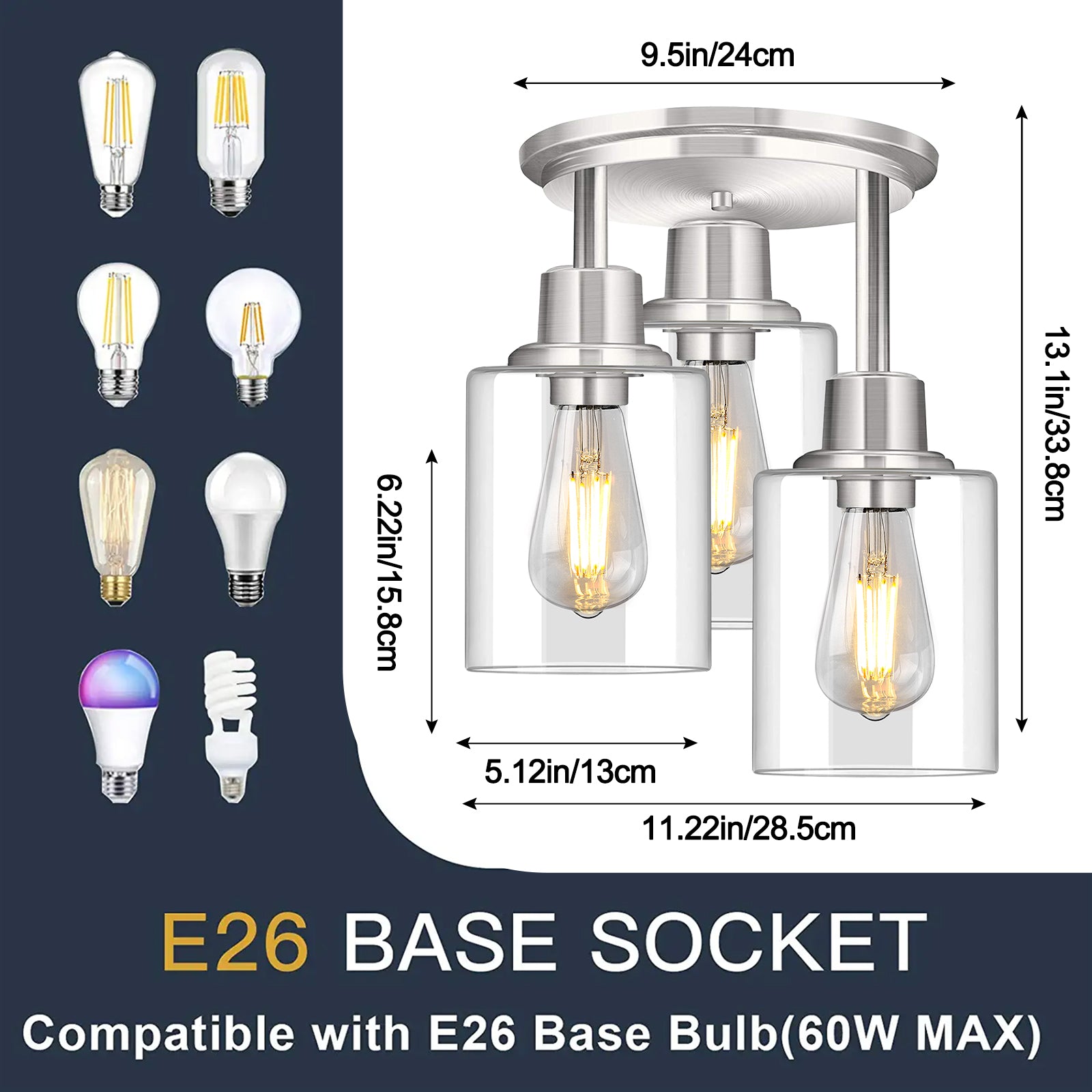 - 【Various Compatibility Dimmable Sockets】You can update the look of the ceiling light fixture at any time simply by replacing diverse bulbs. The hallway ceiling light fixtures apply 3 heat-resistant E26 standard blub sockets (Max. 60W), so you can use all E26 light bulbs to pair them. This bathroom ceiling light will be fully dimmable with a compatible dimmer switch and dimmable bulbs (for safe transportation, not come included).