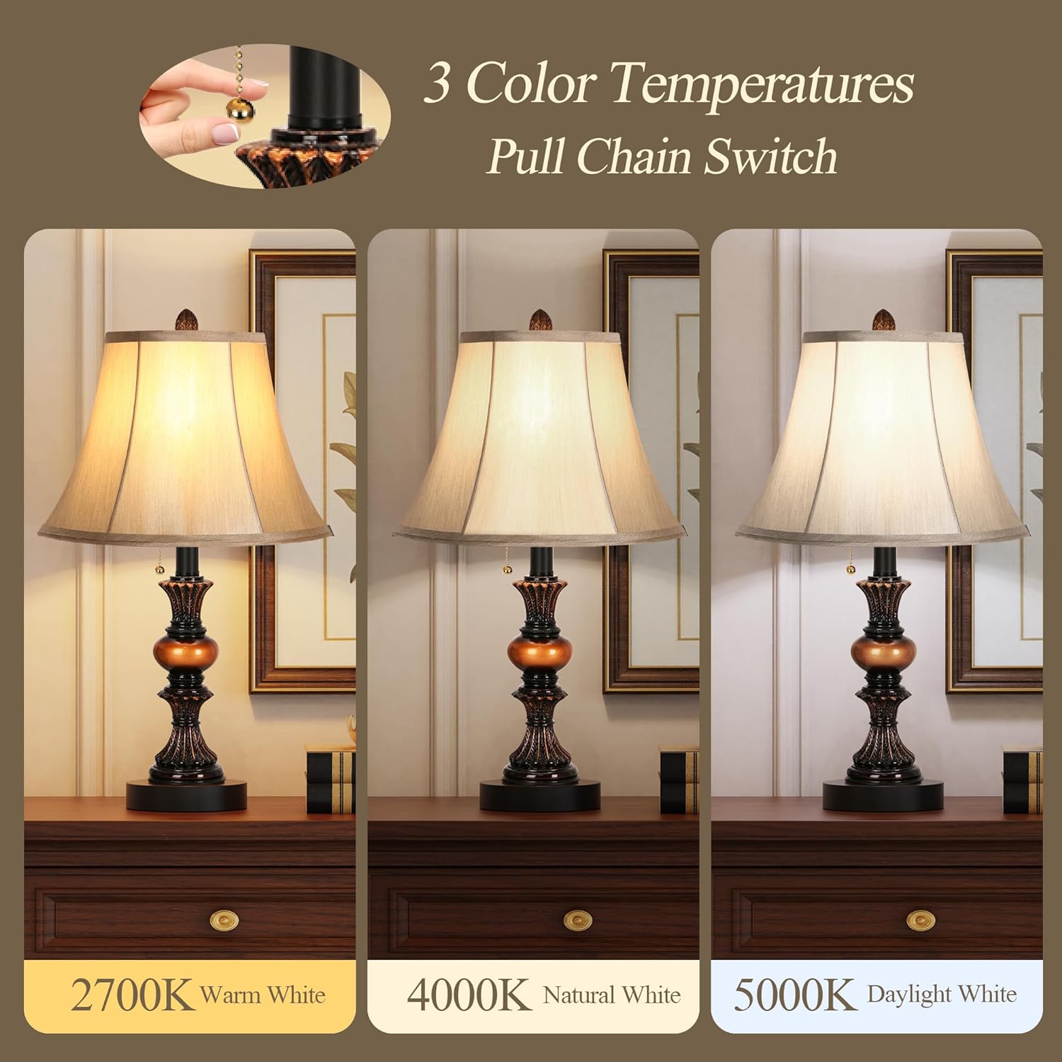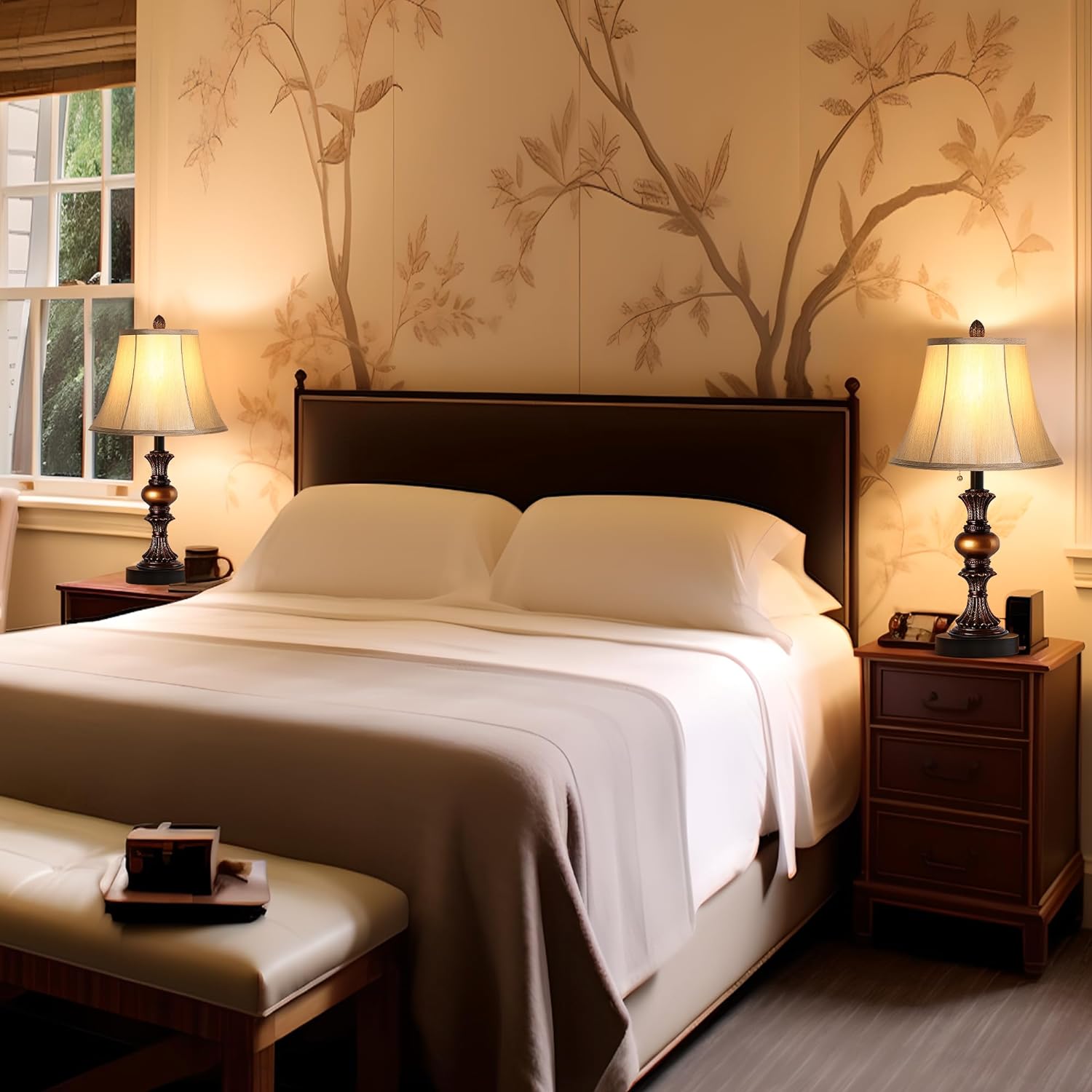 22“ Traditional Table Lamp Set of 2, Vintage Bedside Lamps with Dual USB Charging Ports, 3-Way Dimmable Desk Lamps with Bell Shape Faux Silk Shade for Living Room, Bedroom